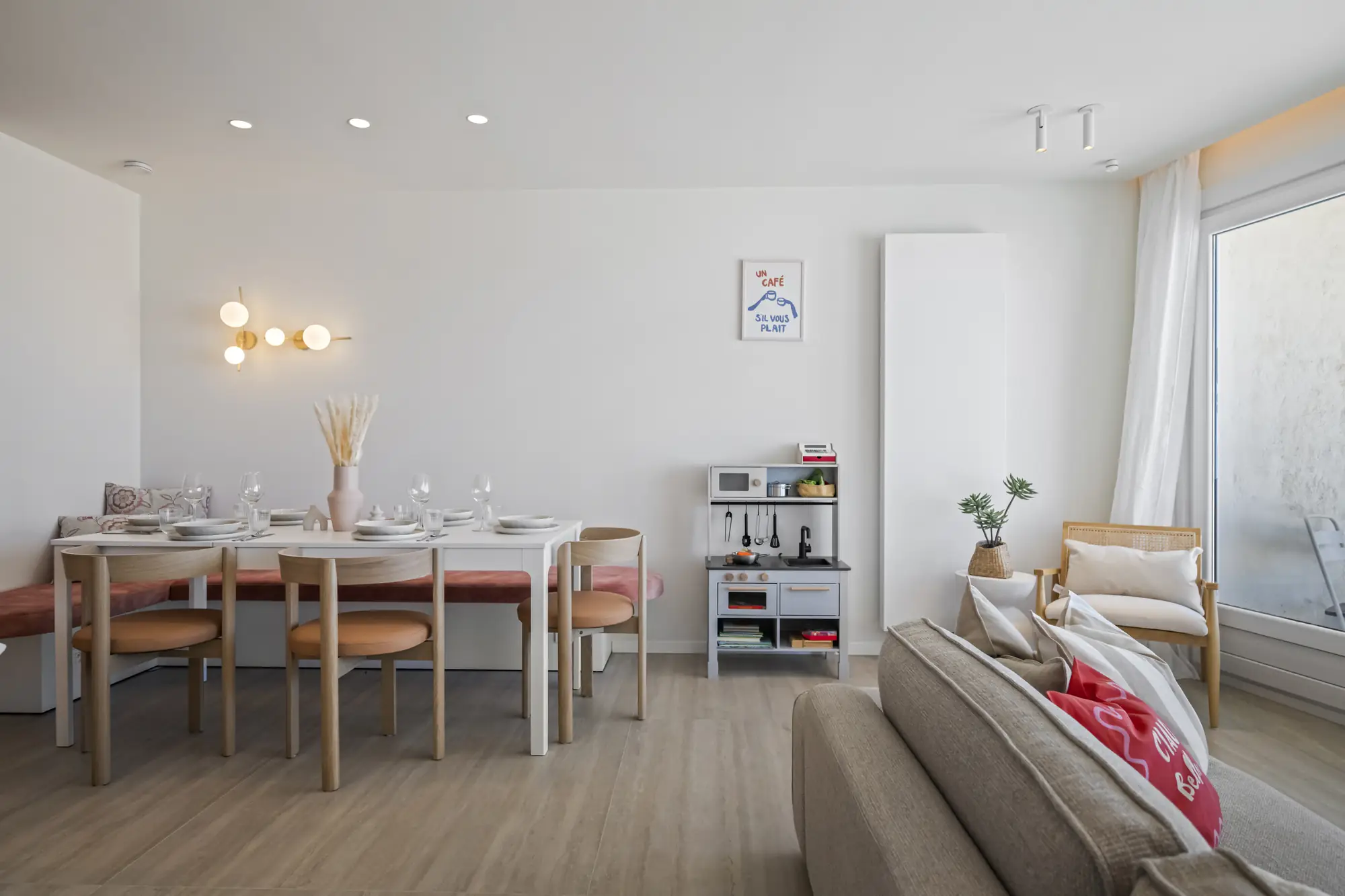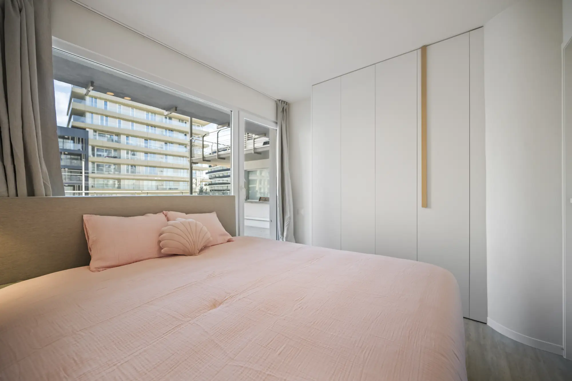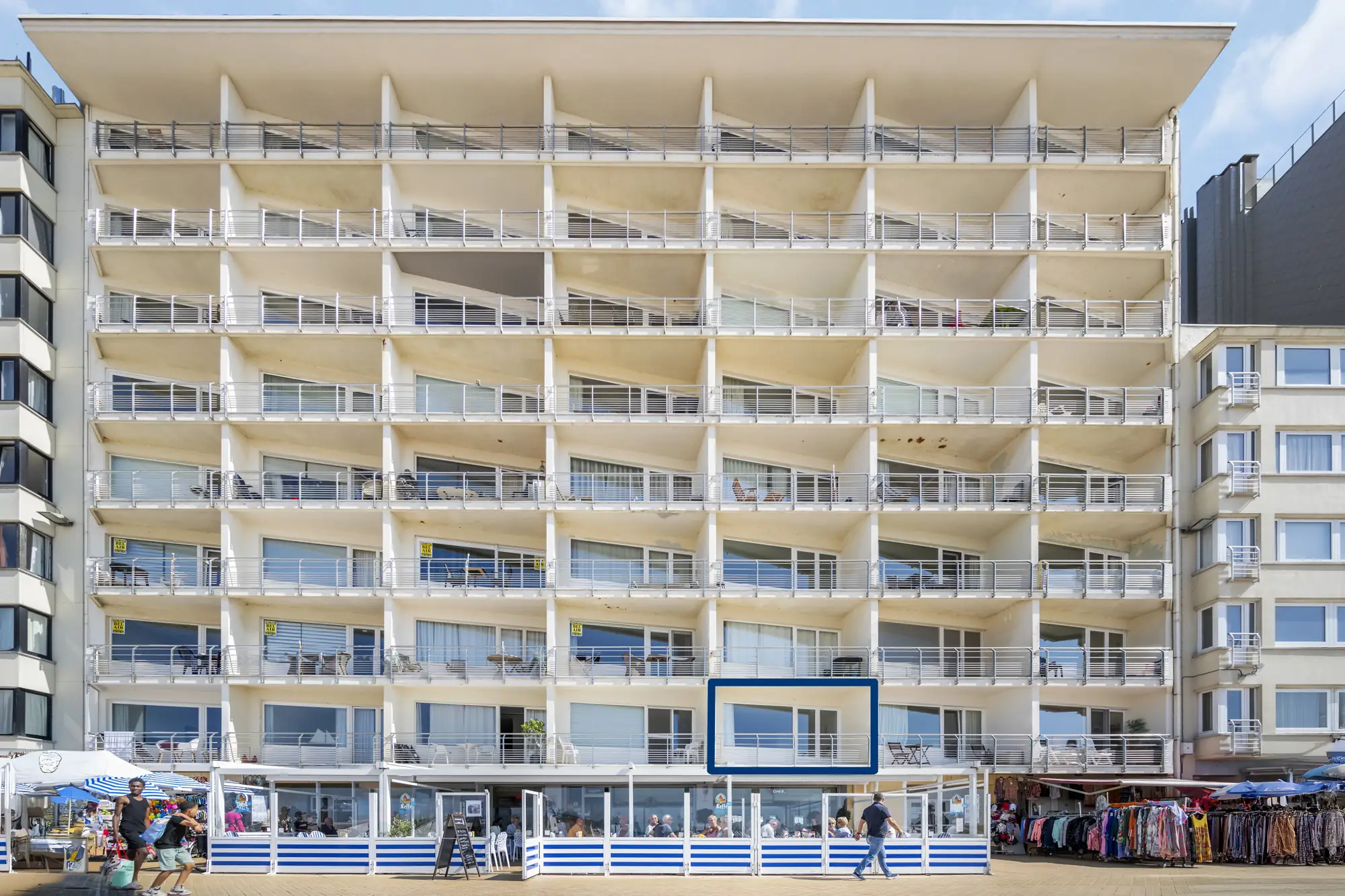 Letterlijk een steenworp. Maison Clarisse ligt op de Zeedijk in Oostende, direct aan zee op de eerste verdieping. Je loopt vanaf de voordeur in minder dan een minuut naar het strand. Het zeezicht is frontaal, wat betekent dat je vanaf het terras en de living uitkijkt over de zee. Voor gezinnen met jonge kinderen is dit ideaal: geen drukke straten oversteken, geen lange wandelingen met strandspullen.